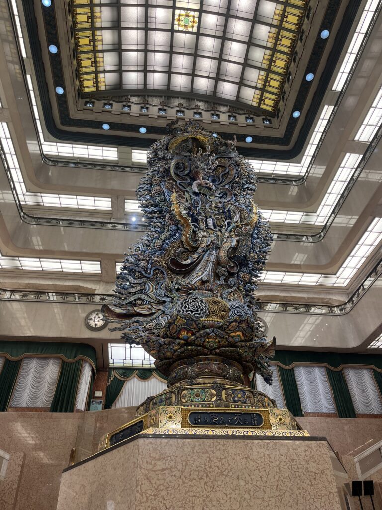 1階の吹き抜けにそびえ立つ、巨大な「天女(まごころ)像」。5階まで届くような圧倒的な空間の使い方は、効率性を重視する現代建築ではまず見られない「老舗だけが持つ余裕」を体現している。